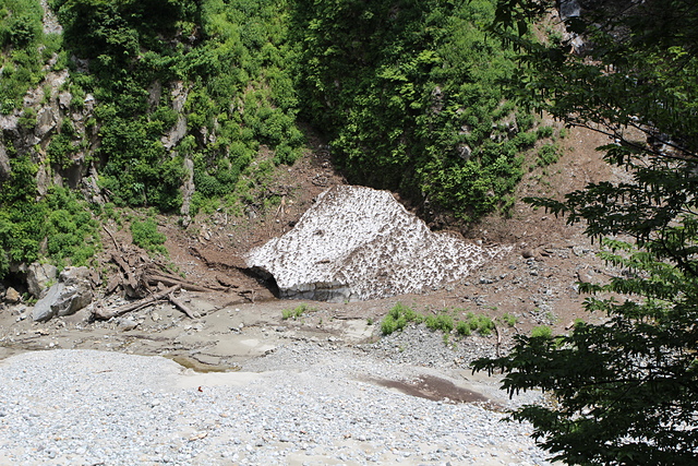↑↓ 黑部萬年雪:對岸的百貫山降雪形成雪崩,掉落下來堆積而成。因為殘雪直到年末新雪覆蓋之前都不會融化,故得此名(萬年?我懷疑,大水來應該就被沖掉了吧?)