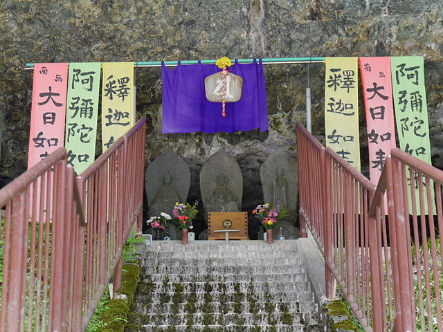 ↑ 車站後方的鐘釣三尊像:為防止黑部川氾濫,守護下游住家免受洪水之災,由信仰虔誠的老婦人所安置的三尊佛像