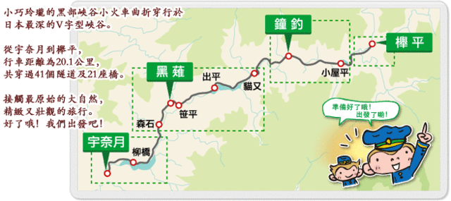↑ 黑部小火車有跟我們的阿里山小火車結為姊妹喔!(聽說我們的阿里山小火車停駛好幾年了@@)