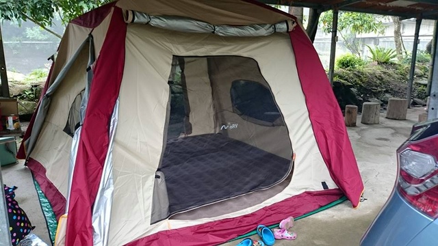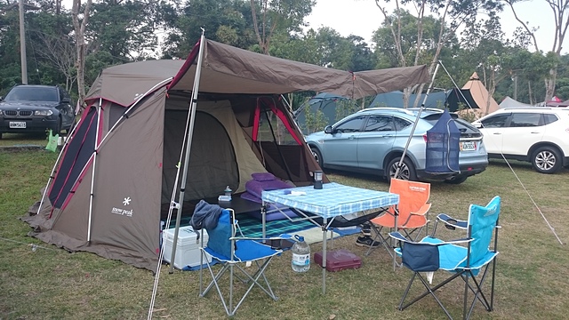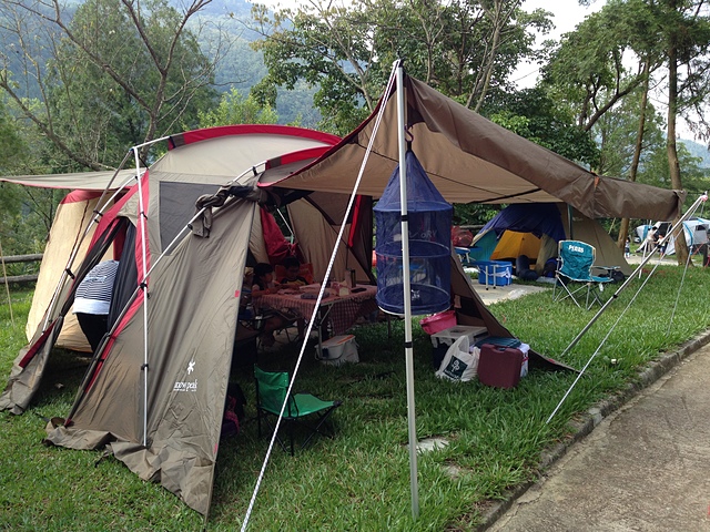 ↑ 第五露(南庄林泉露營區)開新客廳帳TP-623,花了一個多小時才搭好,連營繩都不會拉,由臨時的鄰居露友幫忙下釘