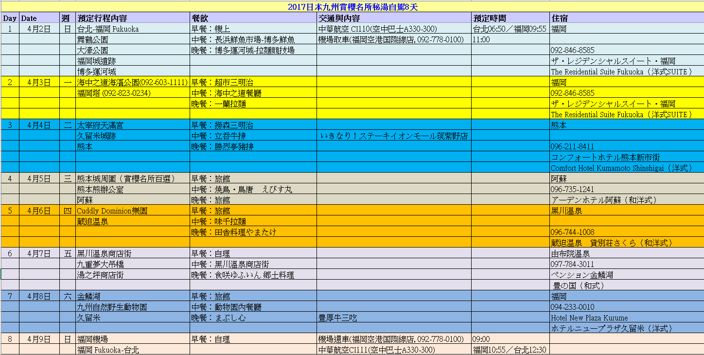 日本九州賞櫻名所秘湯自駕行Day0【行程】 by 虎男 Posted on 2017 年 4 月 11 日2023 年 4 月 10 日 這是第二次來九州, 上一次來是13年前跟天喜的旅行團, 當年的行程記憶也已經跟天喜旅行社隨風而去, 印象較深的只有冒煙的阿蘇火山跟阿蘇農場的饅頭屋,以及豪斯登堡, 連太宰府天滿宮、湯布院、別府這些景點都完全沒印象了。 這次行程也是整段都以自駕為主, 從出機場開始租車, 一直到回台灣搭飛機前還車, 總共開650公里, 就距離來說,沒什麼拉到車。 文章閱讀: 293
