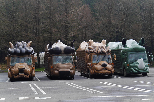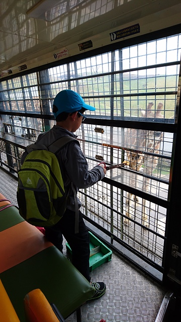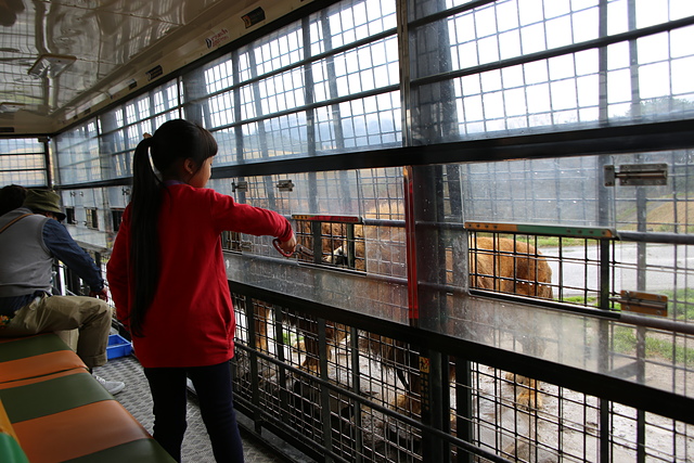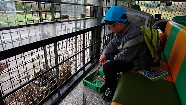 ↑↓ 搭乘Jungle Bus可以進入園區內近距離地餵食各種動物,巴士的造型很特別有犀牛、老虎、水牛等造型