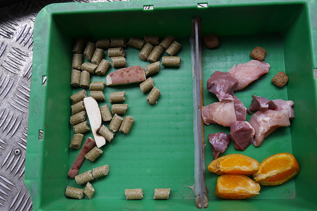 ↑ 餵肉食性的動物時,冷不妨的從天上飛來一隻禿鷹還什麼之類的鳥把肉搶走