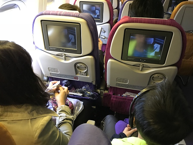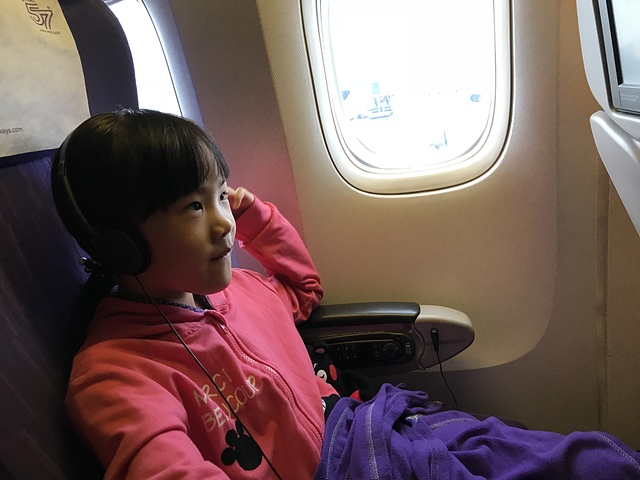 ↑↓ 小鬼們只關心飛機上有沒有個人娛樂電視,其他的無所謂。一上飛機就戴上耳機就預備位置(嗯!我很滿意)