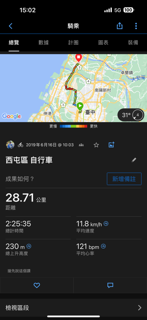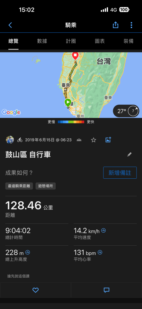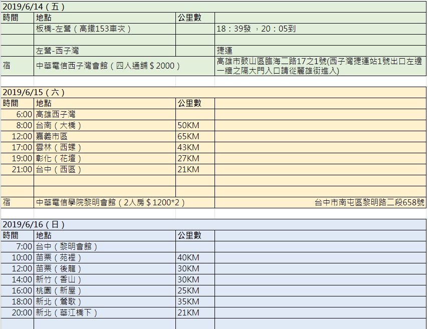 不老騎士之偽環島-四部曲:高雄-台中 by 虎男 Posted on 2019 年 6 月 17 日2024 年 10 月 31 日2019/6/14(五)~2019/6/16(日)原訂的計畫如下,用兩天騎完西部,事實證明我們太高估自己了。騎到台中已經團滅,隔天搭火車回台北XDD帶著車,搭乘高鐵南下高雄來到今晚的住宿點:中華電信西子灣會館房間也太海洋風調整車子必需的消夜左營麥當勞,吃完早餐出發!經過永康工業區台南新市,台一線台南善化,經過曾文溪曾文溪熱爆了來到台南官田路邊一家小吃店吃飯,菜單的羅馬拼音是搞啥的?台南六甲 落羽松森林終於來到後壁騎到這裡剛奛100KM全家便利商店後壁茄苳店,騎到這已經快要陣亡了,屁股已開花奇怪的北迴歸線太陽館北回歸線嘉義民雄,搭火車往台中去哈哈哈,太陽下山了新烏日站月台德州鮮切牛排台中店,吃肉吃肉吃肉星巴克市政門市,沒有車可以拍,拍別人的從高雄騎到嘉義民雄從烏日站騎到台中住宿點台中科學園區在中科迷路了中科,捷安特大甲火車站,準備搭車回板橋幫車子買一張票可以上自行車的電聯班次,不用攜車袋下次繼續 文章閱讀: 271