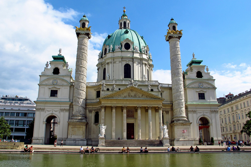 是18世紀神聖羅馬帝國皇帝查理六世,為感謝黑死病結束所建,被公認為維也納最傑出巴洛克式教堂。外觀融合希臘式門廊、羅馬式廊柱&圓頂極具特色,教堂外的廣場是最佳取景地,夕陽時分水池映上倒影更夢幻。內部金壁輝煌,最特別的是能搭電梯到穹頂下方,近距離欣賞華美的宗教壁畫,但觀景台很搖晃有懼高症慎入!