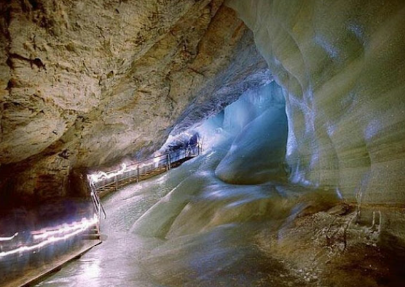 冰洞 Eisriesenwelt:有著石筍的巨大冰洞,於 1879 年為人發現,會於夏季對外開放並提供導覽行程。Eisriesenwelt冰洞雖然交通沒有哈修塔特Dachstein冰洞方便,但是世界最大冰洞的規模就足以讓我們入內朝聖了,如果有安排來薩爾斯堡推薦要做為薩爾斯堡的一日遊行程,非常值得!