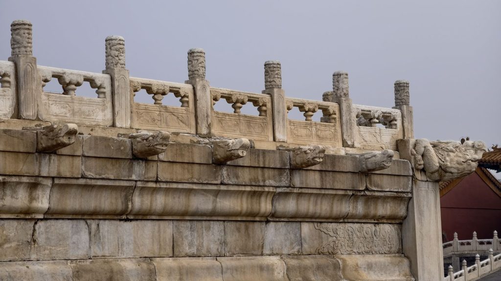 ↑ 這種設計名為 「龍首吐水」,是故宮典型的排水造型,同時兼具「避邪」「導氣」「通水」三重象徵。那些向外探出的「龍頭」就是古人設計的排水口,在下雨時可把屋面與台階的積水導出。