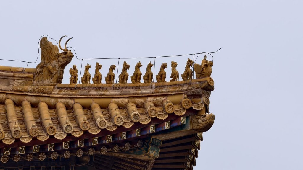 ↑ 在故宮的屋脊邊緣,有這些一串依序排列的陶製小雕像:前方是一位騎鳳的仙人,後面跟隨著各式神獸,牠們一起構成所謂的「仙人走獸」隊列。這是古代建築象徵「鎮邪避火、彰顯等級」的裝飾。只有皇宮與廟宇等最高級建築才能有這樣的排列。