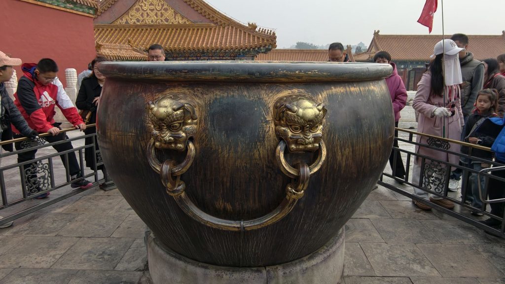 ↑ 「鎏金銅缸」,它們不只是裝飾,而是清朝時期真正的「消防設施」,因紫禁城建築多為木構,最怕火災。因此每個主要殿門外都設水缸,以備滅火之用。冬天時,還會在缸下燃炭保溫,防止結冰