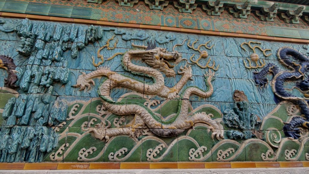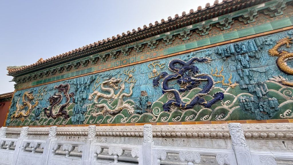 ↑ 九龍壁,建於乾隆二十年(1755 年),是為了修建乾隆皇帝的「寧壽宮花園」時增設的景觀之一。共鑲嵌 2700 多塊琉璃構件,以黃、藍、綠為主色。九條巨龍表面施以高溫彩釉,光線下閃閃生輝,即使兩百多年後仍色澤飽滿