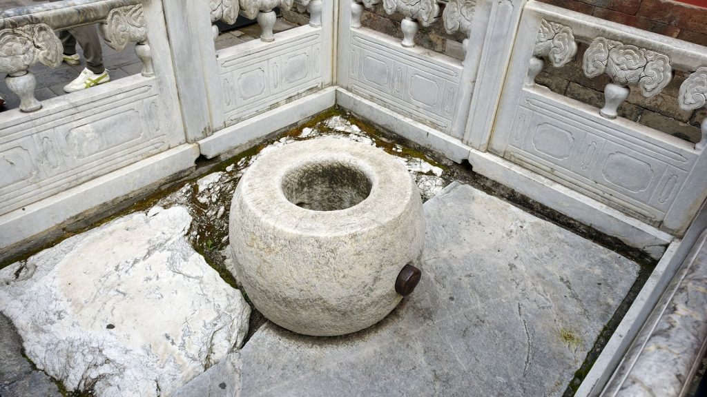 這些水缸原本外層都鍍著厚厚一層金箔(鎏金),金光閃耀,象徵皇權與富庶。然而在 1900 年八國聯軍侵入北京時,外國士兵為掠奪黃金,用刀刮、火烤、斧砍等方式把缸外的金層剝離、融化帶走。至今仍可在缸面上看到那些明顯的刮痕與燒痕。那不只是金子的傷痕,更是歷史的見證。