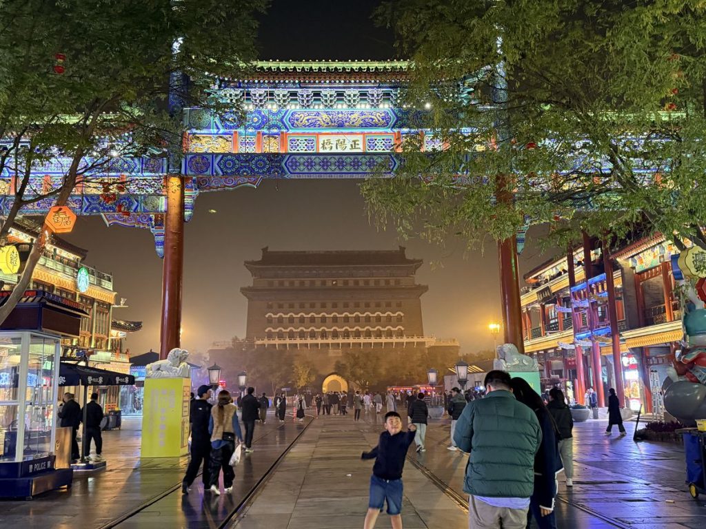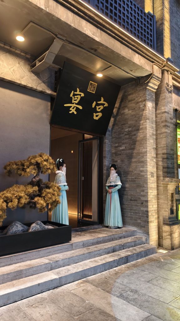 ↑ 離開故宮,搭地鐵來到前門大街,準備來吃「宮宴」。進門前,門口還站著兩位唐代宮女