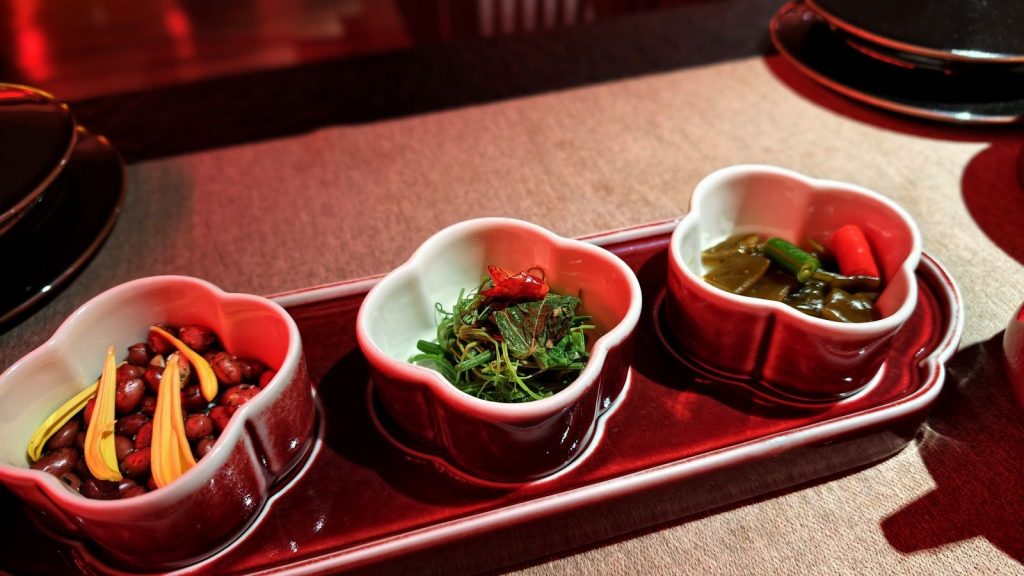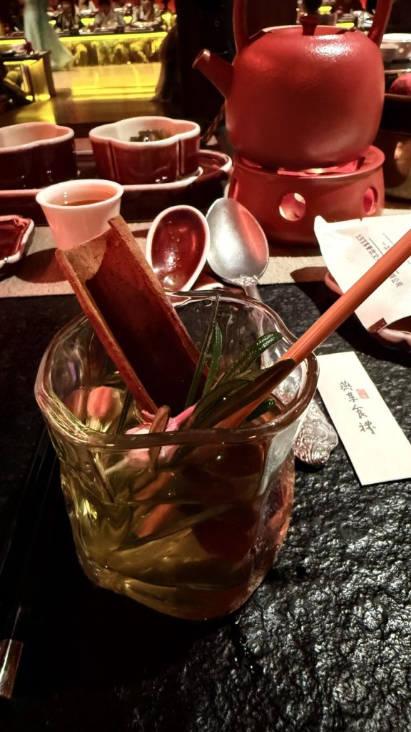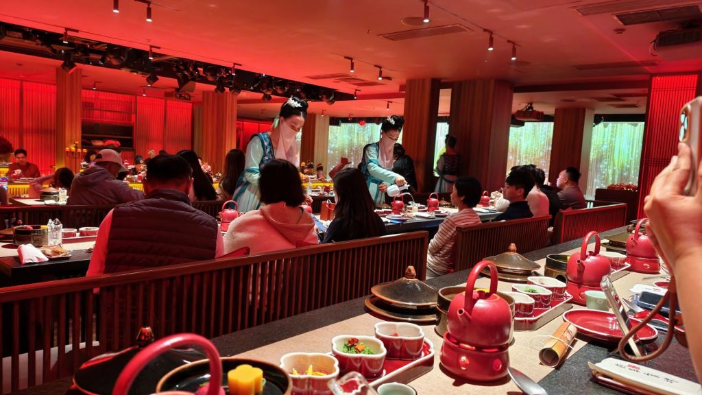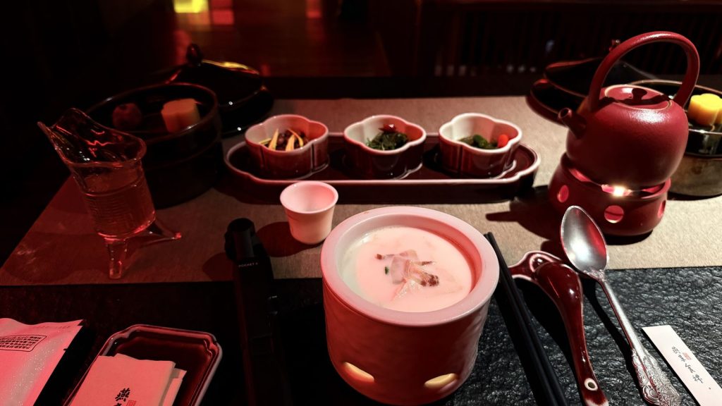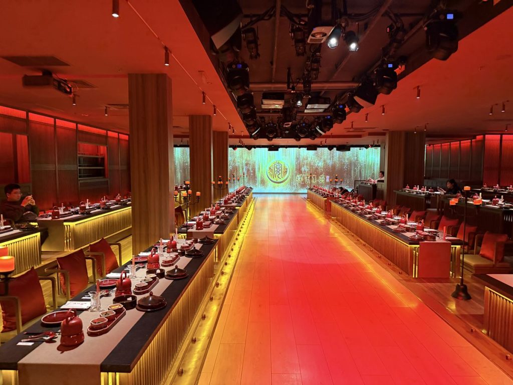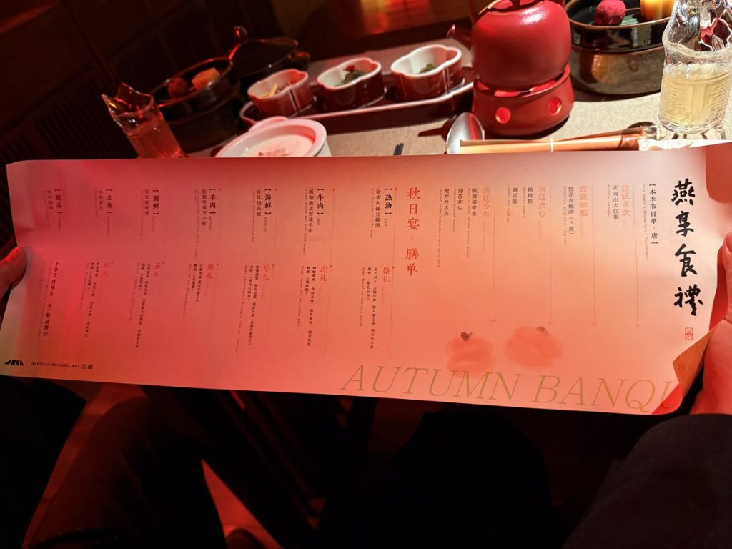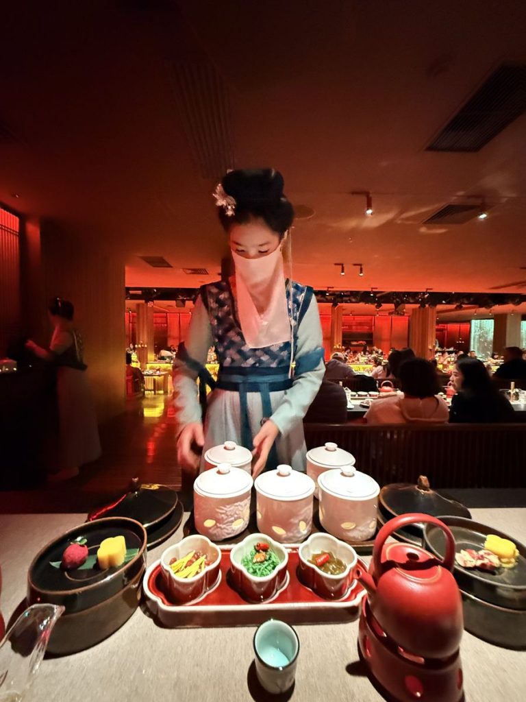 ↑ ↓ 不只是吃飯,而是一場宮廷禮:上菜有「太監報菜」形式宣禮,每道菜名皆以詩句呈現,背景樂為古琴與笙簫合奏,燈光自紅轉金,象徵日落至夜宴的時序