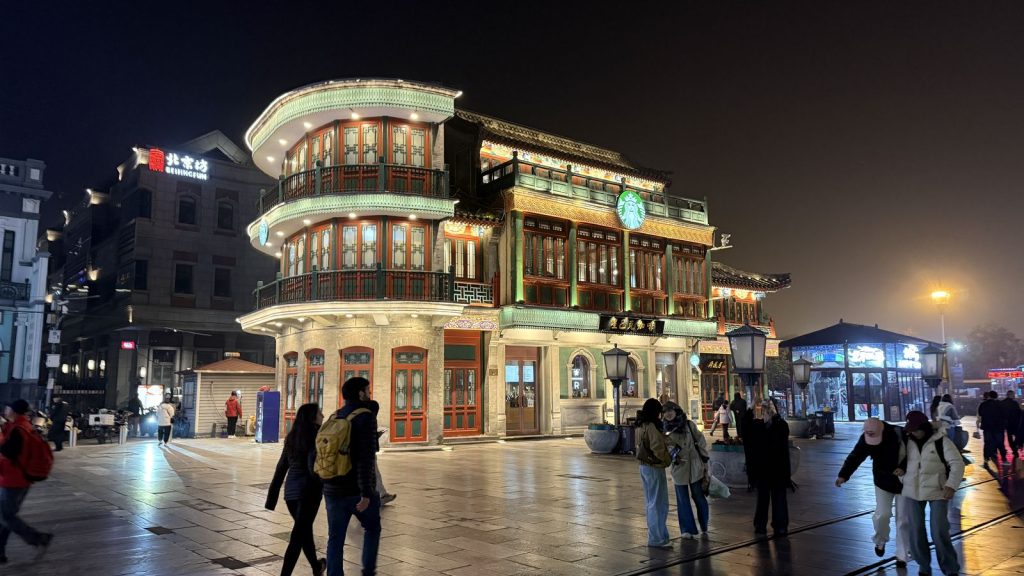 ↑ 仿民國風,融入當地歷史建築的星巴克前門旗艦店。現在這裡的街區採用「仿清式風格+現代商業融合」設計,中軸線上還重現了百年前的 「鉛皮有軌電車(叮叮車)」