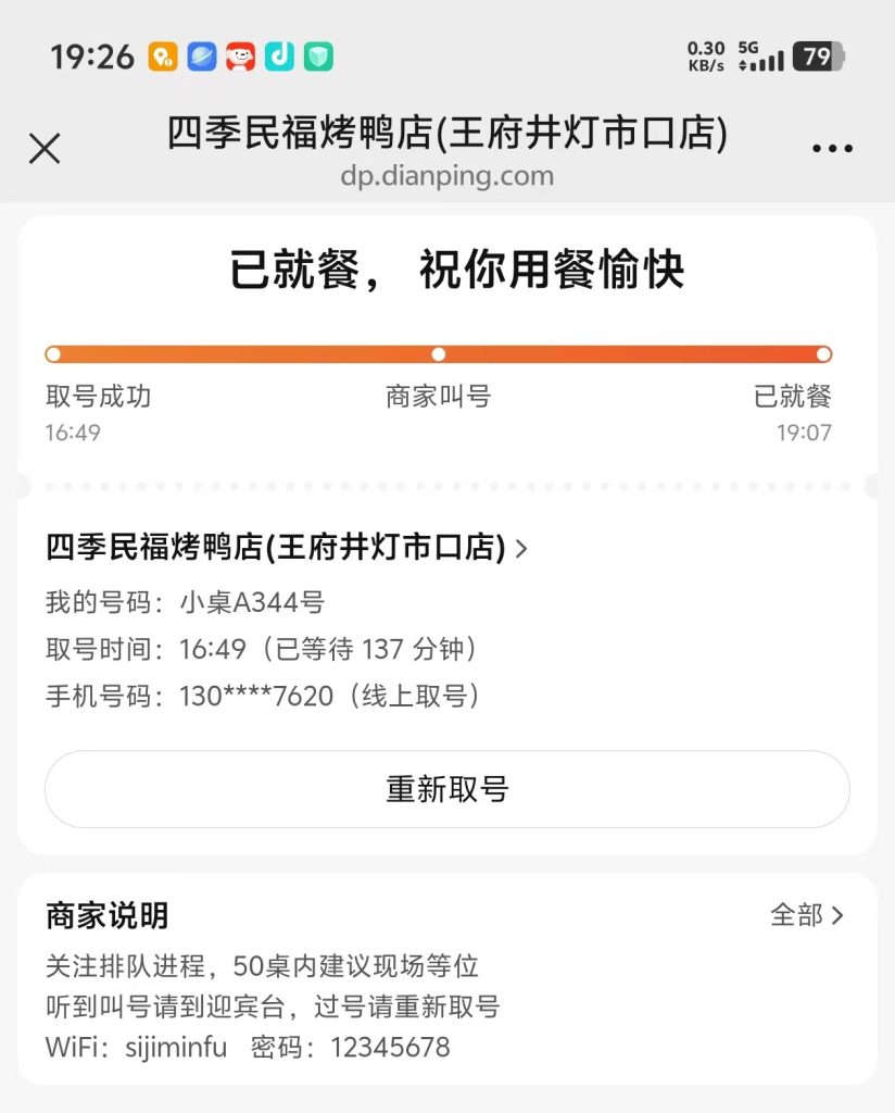 四季民福在王府井有三家店,最熱門的故宮店沒事最好別挑戰,等個上百桌可是輕鬆平常。另外還有燈市口店跟東安門店,一樣下午4點時取號已經排上一百多號,不過燈市口店可以線上取號,對觀光客來說相對友善,可以在別處先逛逛桌號近了再走過去。
