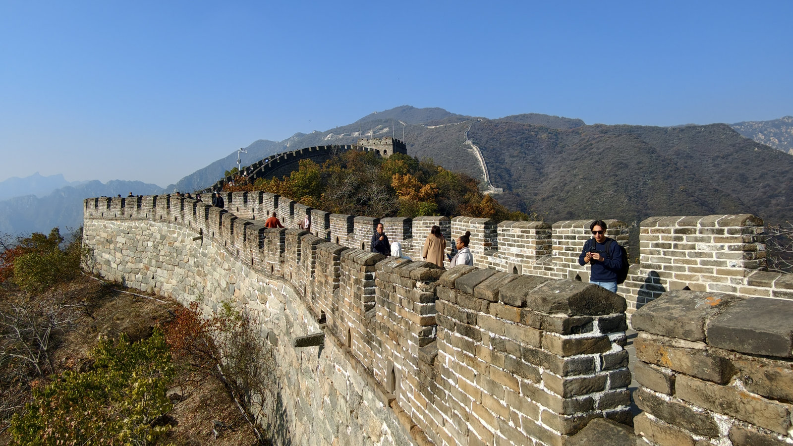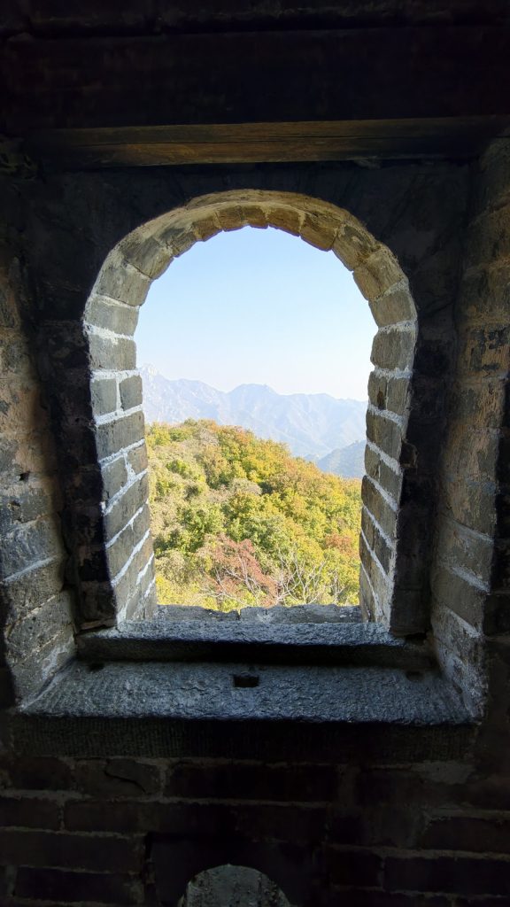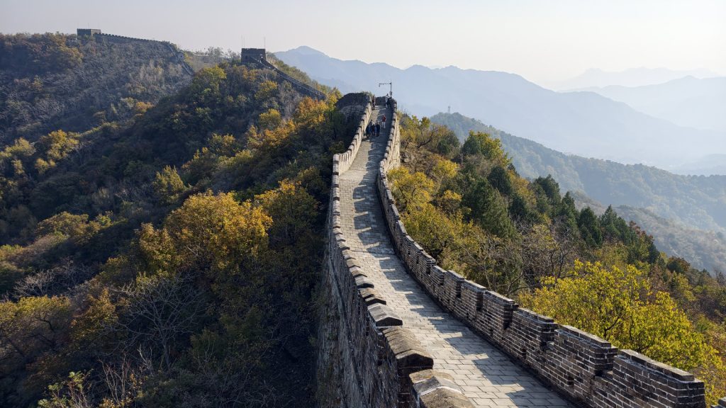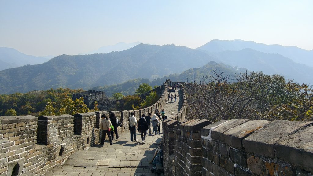 慕田峪不像八達嶺那樣雄偉壯闊,它的美是:山巒層疊,長城蜿蜒,像一條在金色山脊上舞動的巨龍。現在正值秋季,景色尤其動人,栗樹、楓樹、黃櫨染成橘、紅、金色,天氣乾爽透亮,霧氣淡薄,視野極佳。長城沿山脊曲折,拍起照片真的漂亮。站在城牆上看出去,彷彿整個華北的秋天都展開在腳下。