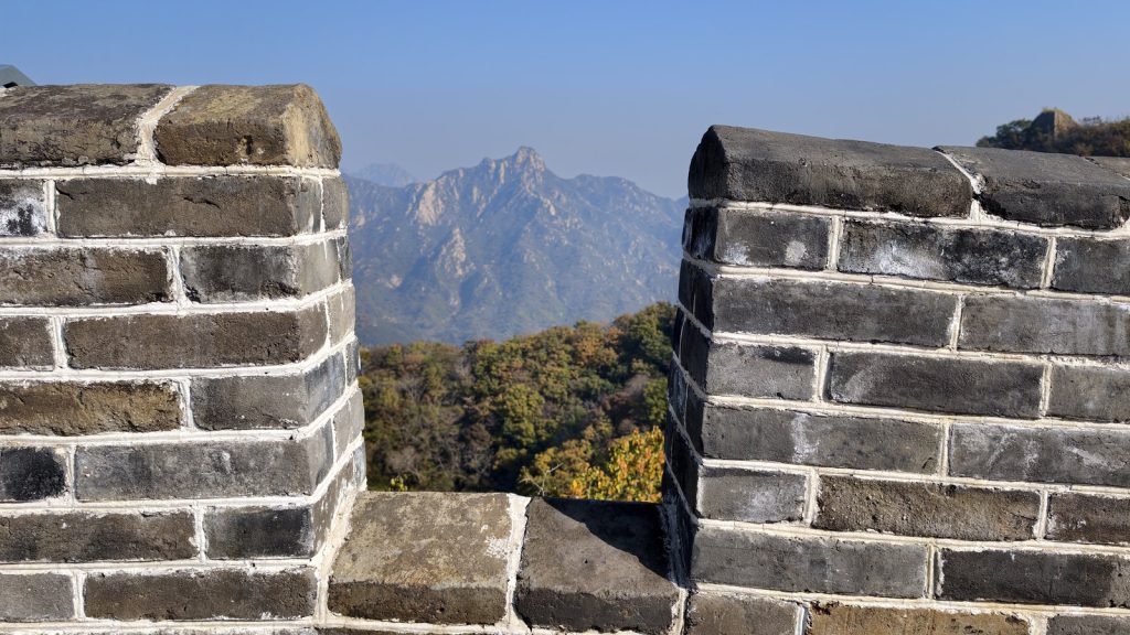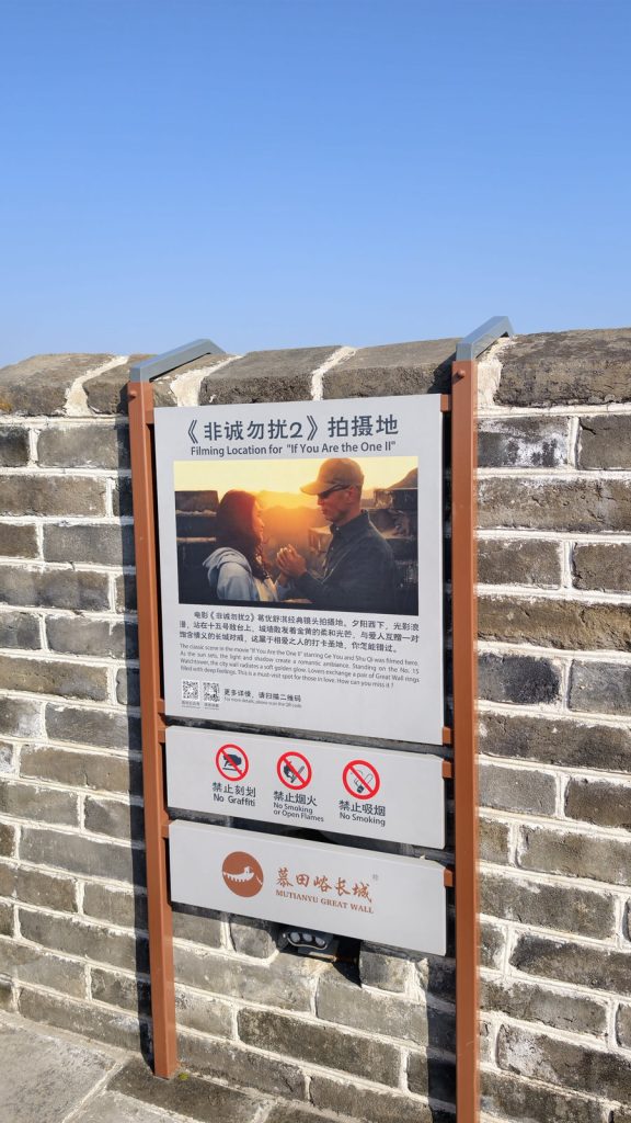往山頭望去,山上大刺刺地寫了「忠于毛主席」五個字,那是上世紀六、七〇年代文革時期留下的標語。那時全國興起「忠字化」運動,標語被塗在山坡、工廠、校園、甚至寺廟,長城因為地勢顯眼、象徵性強,也成為標語書寫地點之一。慕田峪長城一帶山坡寫上這類標語,就是那時的產物。至於為什麼沒有把它清除?主要原因是文革痕跡已成歷史的一部分,作為一種「不重演的提醒」。就像長城的磚石有戰爭痕跡、北京老城牆有清代刻字,而這些白字是 20 世紀留下的文化烙印。