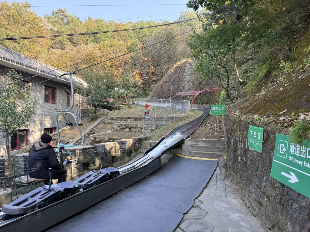 滑道,是慕田峪最獨特有趣的一項體驗,位置在6號敵樓附近,搭乘一種類似雪橇式小車,坐著沿著軌道滑下山。非常好玩,沒有八達嶺,但有慕田峪滑道!速度可自己藉由推桿前進、拉桿減速來控制。一路上風景貼近樹林,像從山間飛下來,從柯林頓到奧巴馬、甚至湯姆克魯斯都玩過這個滑道。重點是,想玩要趁早,超過六十歲就不給玩了。