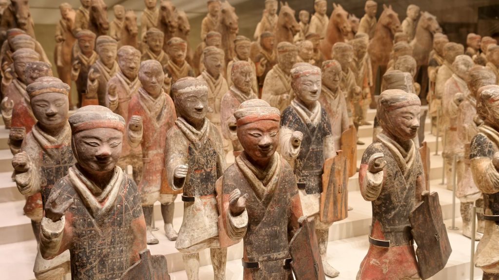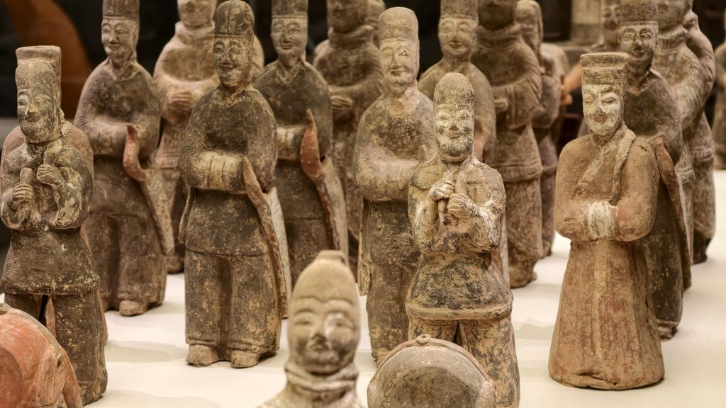 ↑ 唐代的「文官侍從俑」,表情樸拙、有笑意(唐俑很常帶微笑),塗繪沉厚,但仍可見紅赭色、肉色。這些俑象徵君主或貴族的隨從班列,類似於把整座小型社會縮小塞進墓裡