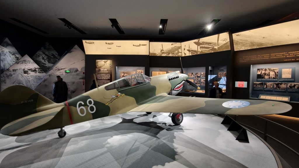 ↑美製P-40戰鬥機,抗日時期成立的中華民國空軍美籍志願大隊,引進P-40B戰鬥機,飛機頭部畫上鯊魚頭,未見過鯊魚之昆明市民稱作「飛老虎」因而命名為「飛虎隊」。上頭還有中國國民黨的黨徽