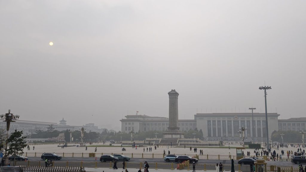 ↑↓ 參觀完國博,出口處對面就是人民英雄紀念碑、人民大會堂與天安門廣場,今天的霾害頗嚴重,太陽都快變成月亮