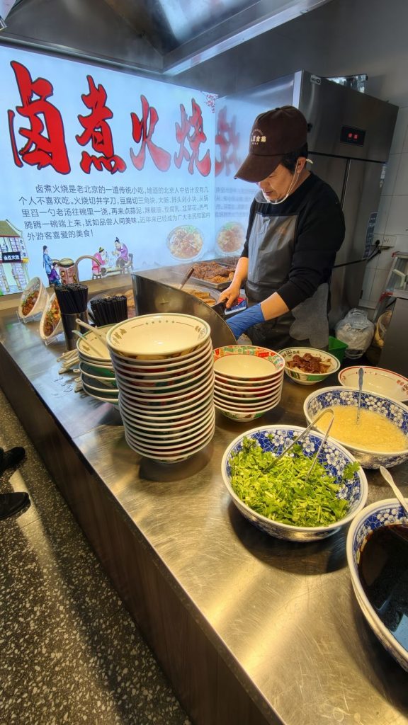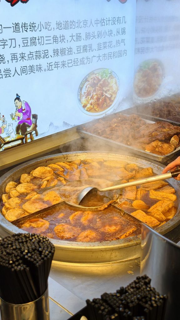 在所有北京小吃裡,如果豆汁算「考驗膽量」,那滷煮火燒就是「真功夫」。它是北京非常傳統、非常老派的街頭小吃,主要食材有:肥腸、豬肺、豬肝、豆腐泡、豆皮,以及主角:火燒(切小段的老北京燒餅)。所有食材用大鍋燉在濃郁的老滷汁裡,顏色深黑、味道厚重,是那種「一聞就知道這家店老不老」的味道。